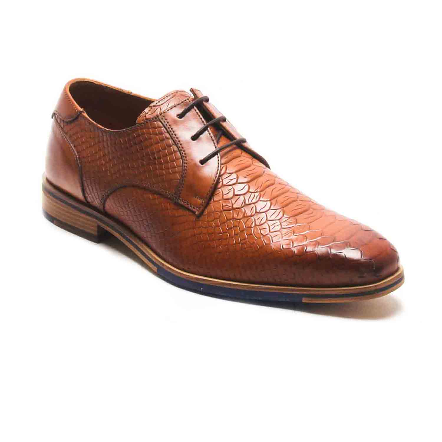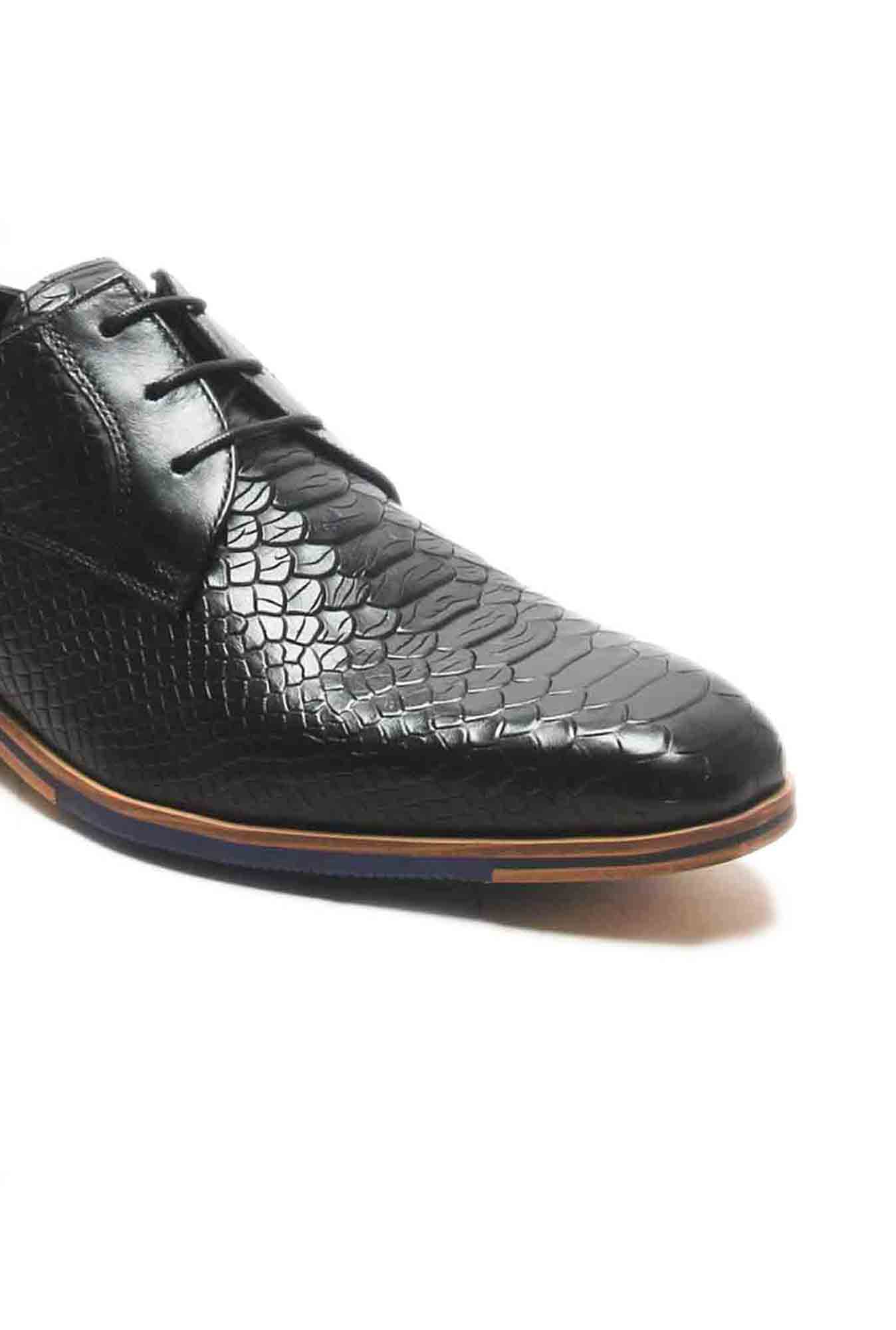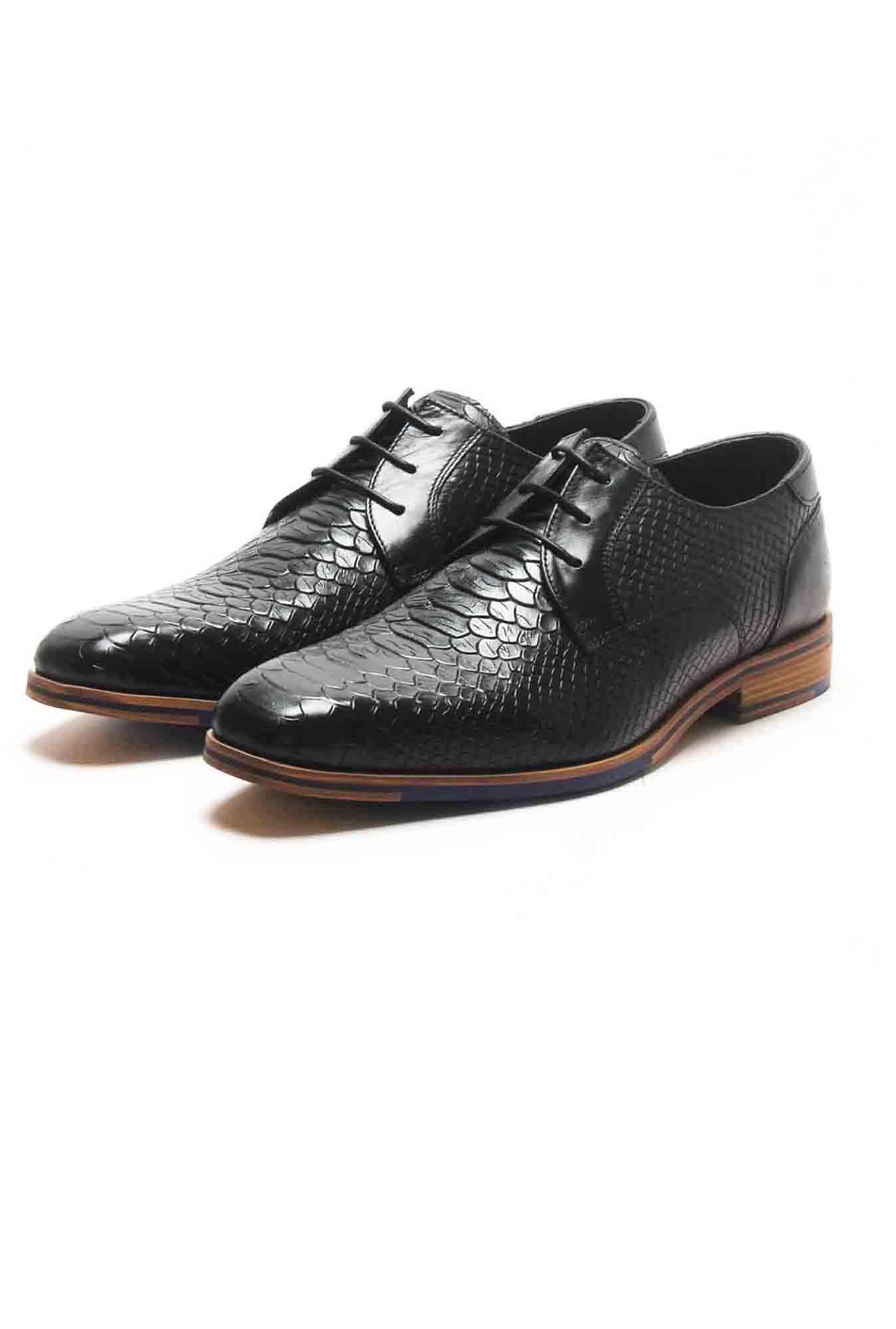 Your occasion-ready footwear just got a wild upgrade with these snake-print textured lace-up derby shoes. With its snake-skin inspired texture, these leather lace up derby shoes will definitely be a perfect addition to your party wear closet. Featuring a mildly cushioned footbed, these shoes also make for a great choice for events with their low heel tunit sole. You will be comfortable in these super stylish and completely suave lace up shoes as you flaunt them with a bespoke navy suit at your next social event or business event. Don't forget to pair it with a matching formal belt, in a textured finish to complete the runway look.